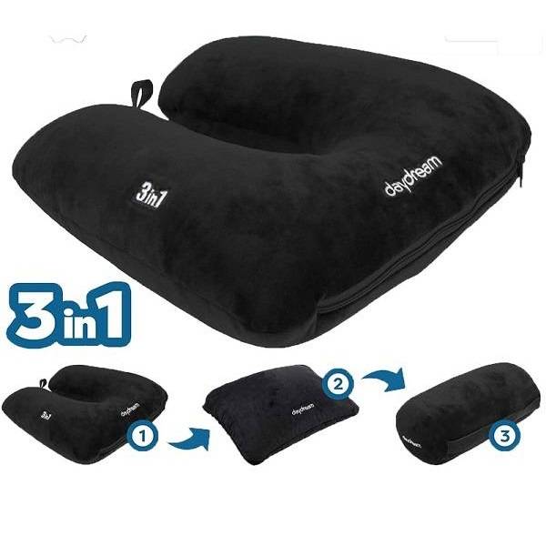 Esta almofada de funções, têm almofada de pescoço, rolo de pescoço e almofada normal em um só artigo, é leve e ideal para longas viagens.