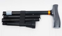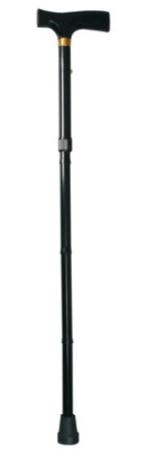 Perfil e Instruções de Utilização: Bengala dobrável serve como auxiliar de marcha a pessoas com mobilidade reduzida. Instruções de Utilização: Verifique se a moldura está danificada para garantir uma utilização segura para pessoas e coisas. Pressione o botão, deslize a bengala e leve-a a corresponder aos orifícios na altura exigida e à manobrabilidade do paciente. Coloque o pino no orifício para bloquear a bengala e certifique-se de que o botão está completamente no interior do orifício. Tenha muito cuidado em superfícies molhadas e escorregadias.
